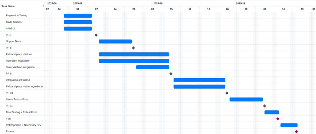 | 2 | 2/12/25 | 3/24/25 | rlopesca | The flow rate of the suction end effector is not high enough to pick up bread. | 1. Introduce items (such as an acrylic plate) to the environment that can be used to pick up the bread. 2. Design a new tool onto the end effector that can pick up the bread. 3. Purchase a new system. | Purchase a new, higher flow rate suction system. | A new, higher flow system integrates directly into our system and provides the least amount of technical complexity. |