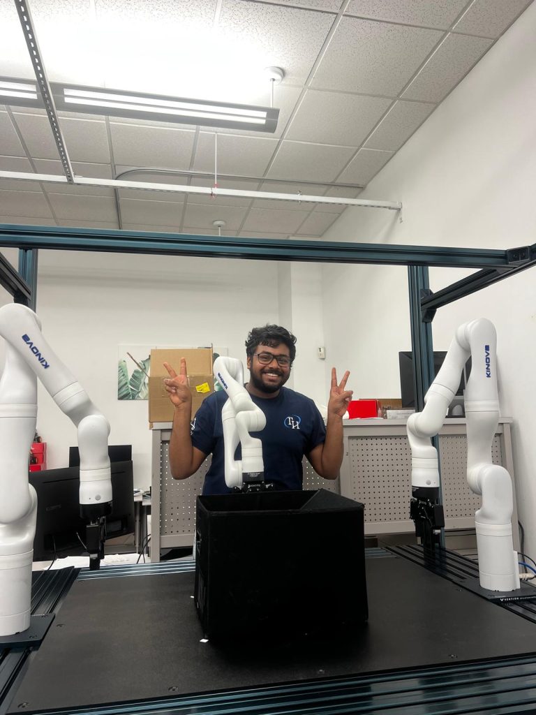 Media FINAL Fall Demo Video: https://www.youtube.com/watch?v=BegzR10ZfIM Spring Demo Video: https://www.youtube.com/watch?v=HGuhu5w-aAU Poster Presentation Picture Gallery demo setup hard at work team pic (- kartik) moveit execution calibration mujoco test ZED calibration Arms lift! Mascot bon bon test object Rviz arm simulation pose estimation calibration with our mentors FVD